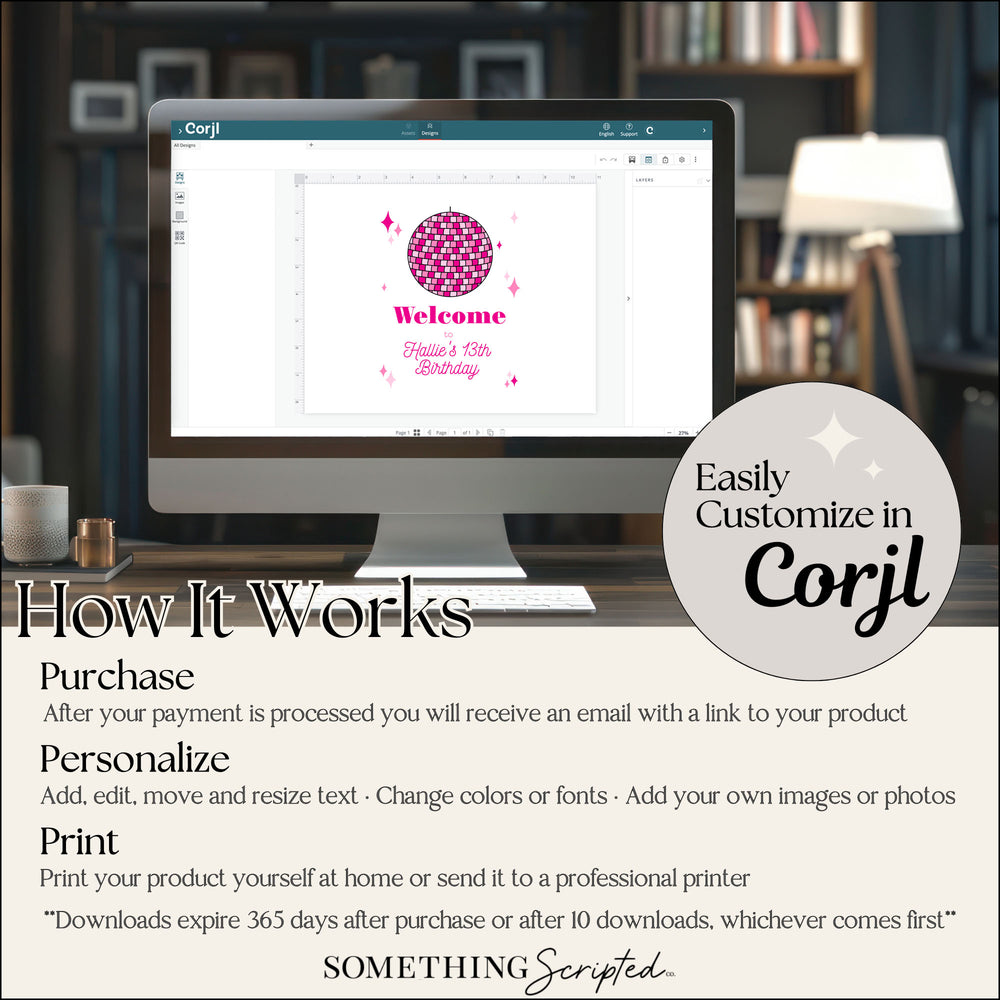Download, print, and display instantly for an easy and eye-catching decoration. The pink disco ball design brings retro flair and excitement, making your event unforgettable from the moment guests arrive.