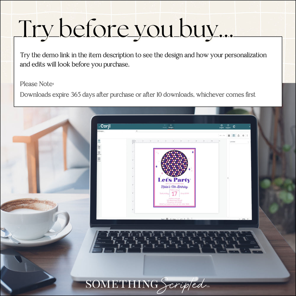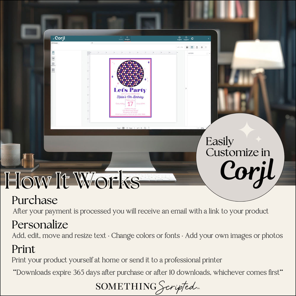 Get groovy with this purple disco ball invitation! Perfect for disco-themed birthdays, bachelorette parties, girls’ nights, or milestone celebrations, this editable printable invite adds sparkle and retro flair to your event.