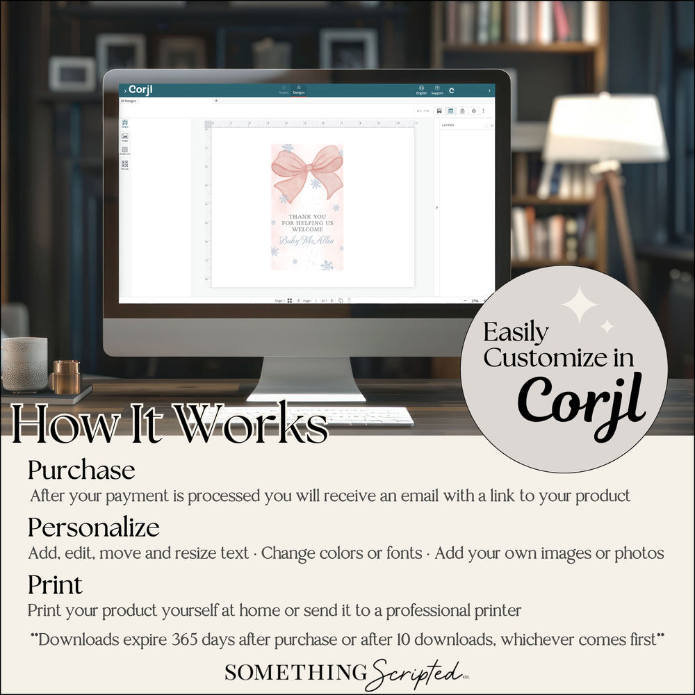Your order will be processed as soon as payment is complete. You will receive an email from Corjl with a link to access your file where you can make all necessary edits. You can also go to Corjl.com and enter your email address along with your order number to access your file.