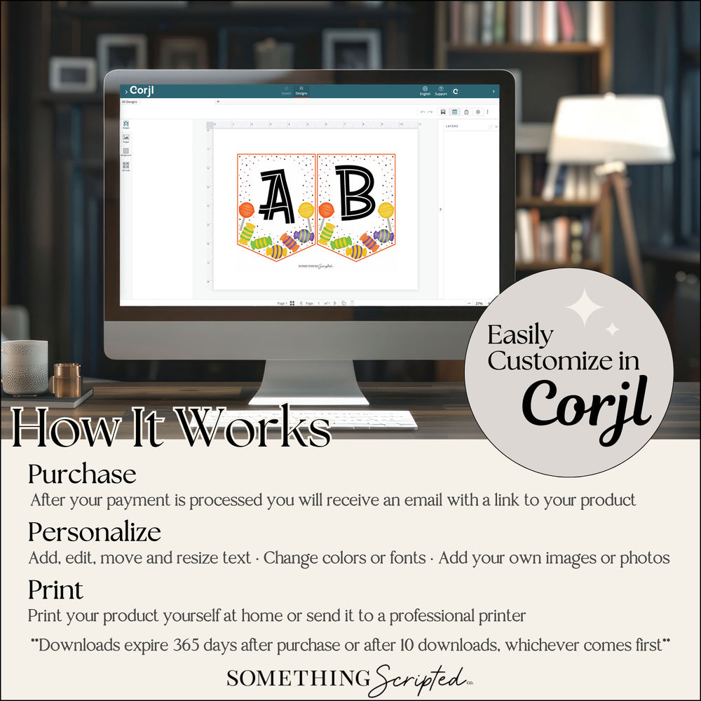 Decorate your party with a sweet and spooky touch using this Halloween candy printable banner! Editable in Corjl, this banner can be personalized online, then downloaded and printed at home for a quick and festive party decoration. Perfect for Halloween parties, classroom celebrations, or trick-or-treat events, the colorful candy design makes your space fun and inviting.