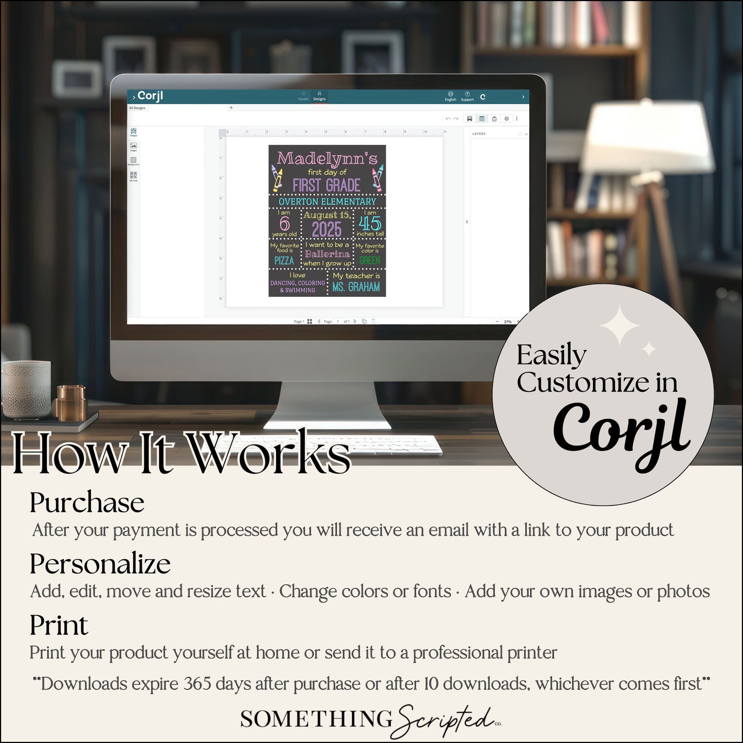Easily personalize the sign with your child’s name, grade, teacher, date and favorites using a free editing website Corjl! Print at home or your favorite print shop for a quick and easy back-to-school keepsake.