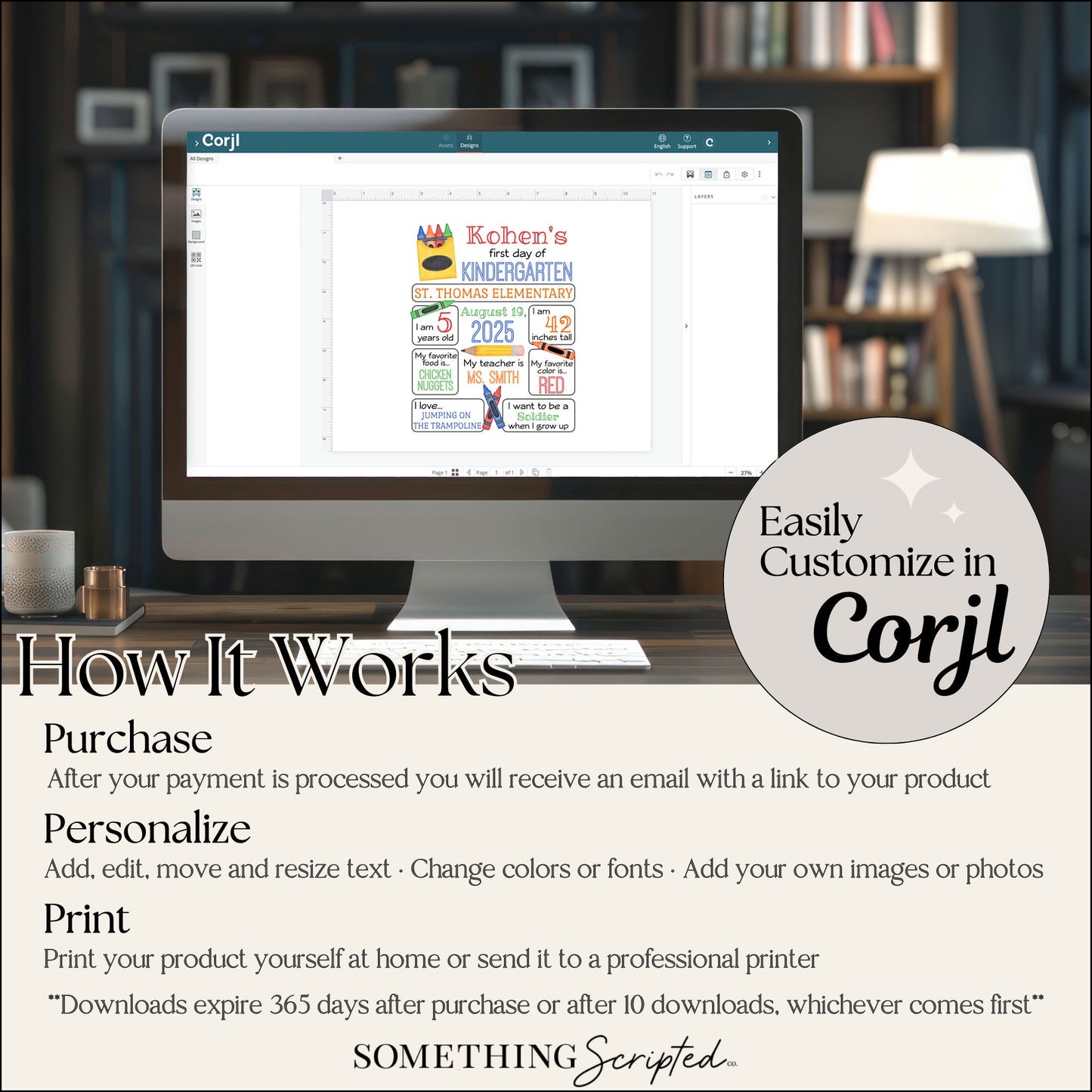 Easily personalize the sign with your child’s name, grade, teacher, date and favorites using a free editing website Corjl! Print at home or your favorite print shop for a quick and easy back-to-school keepsake.