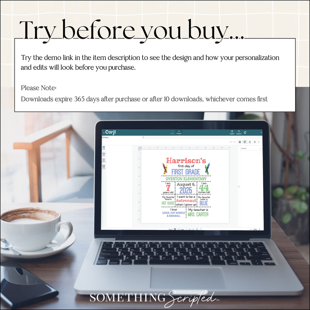 Easily personalize the sign with your child’s name, grade, teacher, date and favorites using a free editing website Corjl! Print at home or your favorite print shop for a quick and easy back-to-school keepsake.