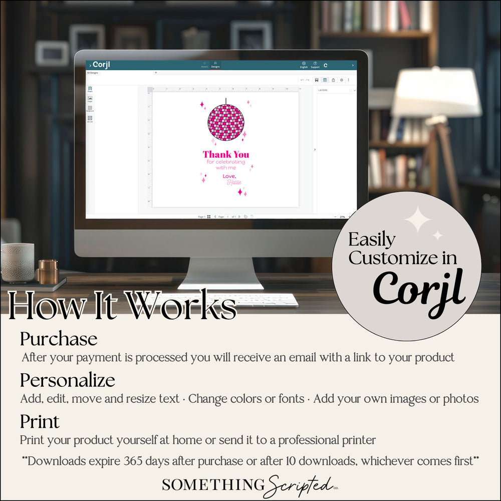 Easily customize the text with your own message before printing. Use them for party favors, gift bags, or small thank-you treats to keep the disco vibes alive!