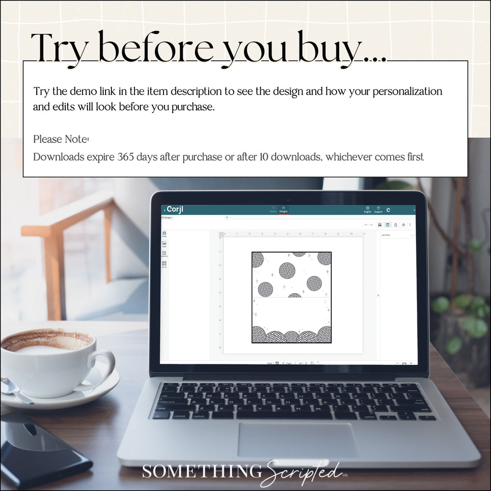 Something Scripted Co does not guarantee perpetual storage of any purchased items. Buyers are responsible for downloading purchases within 10 days of order fulfillment. This is a digital download therefore no returns, refunds or exchanges will be processed. Please email hello@somethingscriptedco.com if you have any issues with your order.